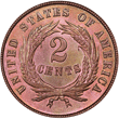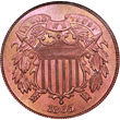 The Two Cents(or called Double Cent) coin series is one of the short lived and odd denomination coin in the US coin history. These classic, about 150 years old coins are not very popular item for collectors but very interesing and affordable item. The national motto "In God We Trust" appeared for the first time on this coin. The shield design on ovberse is very similar to that on the Shield nickel.