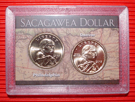 holder has two openings for Uncirculated Sacagawe or Native American dollars, one for Denver mint coin and the other for Philadelphia.